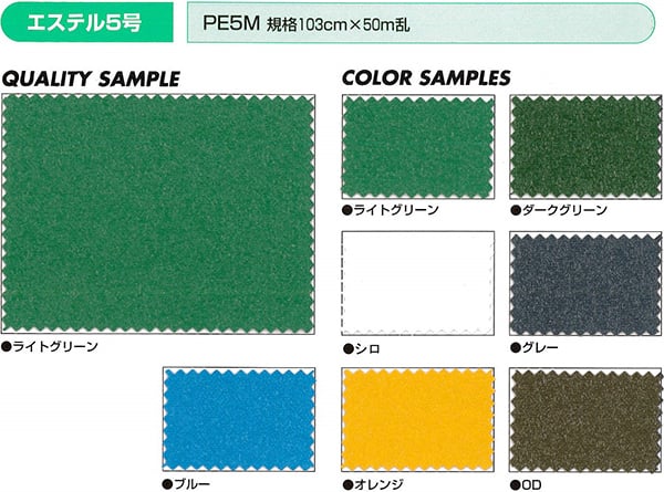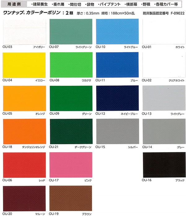 大きく分けると1類と2類があります。1類は2類よりも厚いです。2類を使うことが多いです。色はエステル帆布より多く基本色はそろっています。防炎材料です。