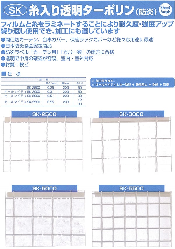 0.1mm台から数ミリまであります。格子状に糸が入っていて表面をラミネート加工しているフィルムシートや防炎、静電、UVカット加工等の機能性材料があります。厚みは0.3mmがよく使われます。防炎や静電加工をしている材料もよく使われます。