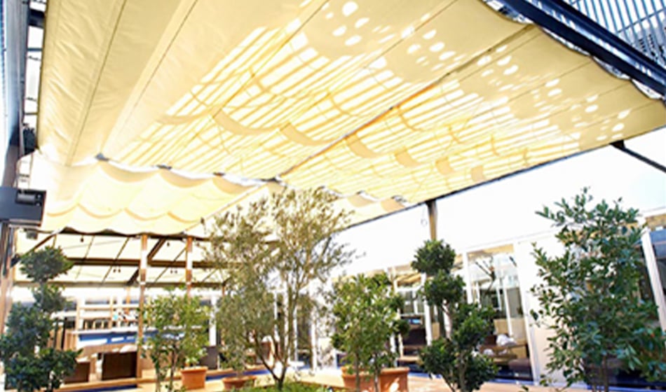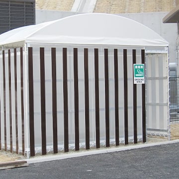 喫煙コーナーを屋外に設置する時にテントが利用できます。屋根と目隠しを作れます。テント材:中型テント用帆布(防炎)/ 糸入透明フィルム(防炎) -
